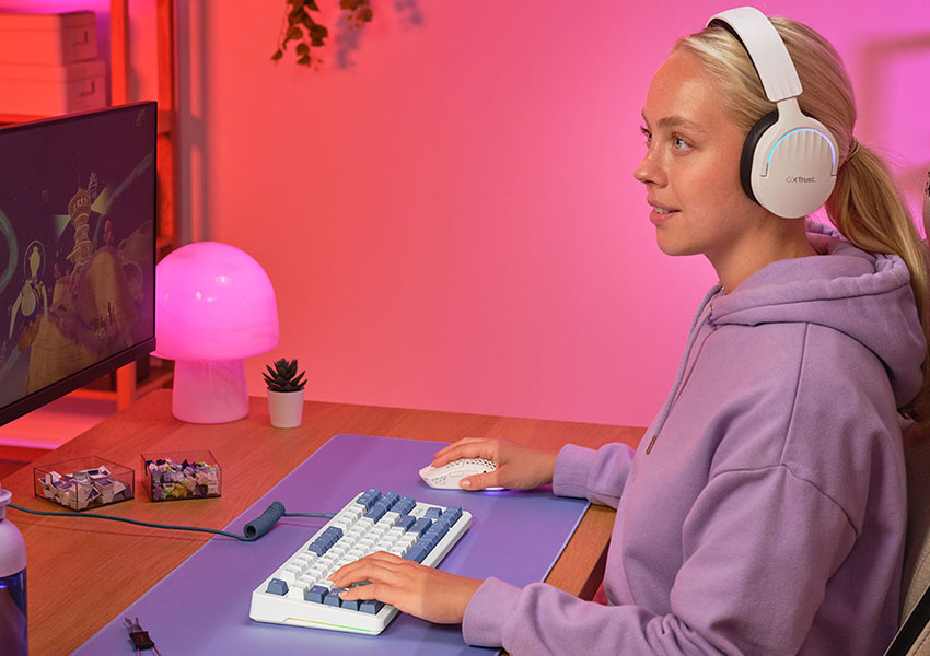 Rueda metálica con desplazamiento libre y triple enlace inalámbrico en el ratón. Hot swap de 3 y 5 pines, montaje con juntas y RGB en el teclado.